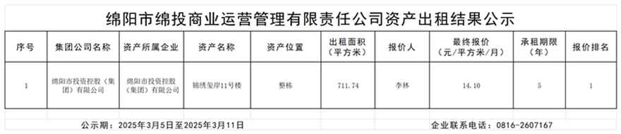 綿陽市綿投商業(yè)運營管理有限責任公司資產(chǎn)出租結果公示