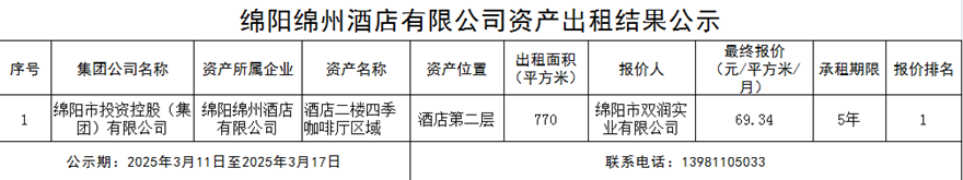 綿陽綿州酒店有限公司資產(chǎn)出租結(jié)果公示