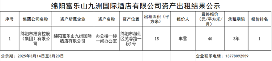 綿陽(yáng)富樂山九洲國(guó)際酒店有限公司資產(chǎn)出租結(jié)果公示
