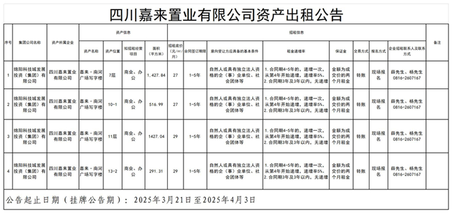 四川嘉來(lái)置業(yè)有限公司資產(chǎn)出租公告