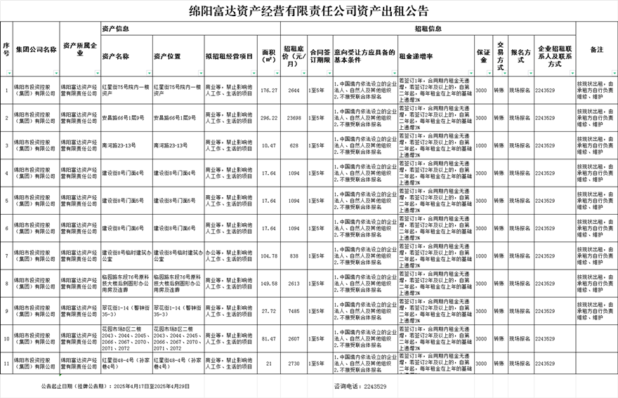 綿陽(yáng)富達(dá)資產(chǎn)經(jīng)營(yíng)有限責(zé)任公司資產(chǎn)出租公告