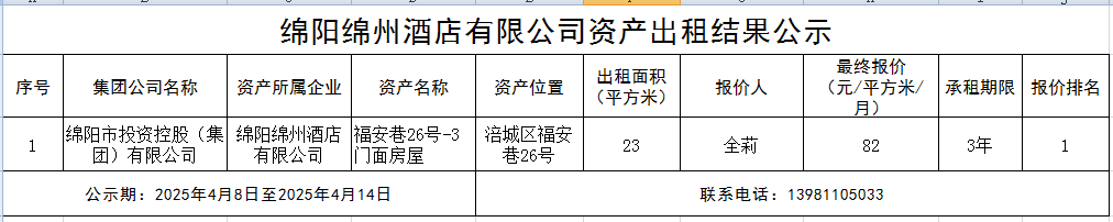 綿陽綿州酒店有限公司資產(chǎn)出租結(jié)果公示