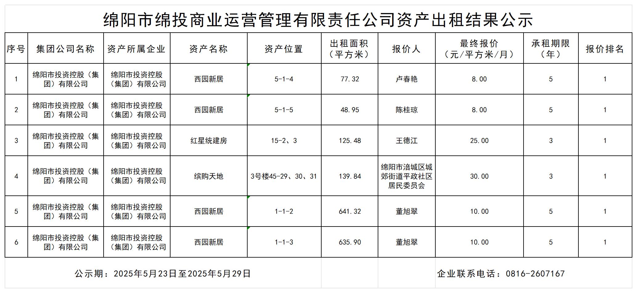 綿陽市綿投商業(yè)運(yùn)營(yíng)管理有限責(zé)任公司資產(chǎn)出租結(jié)果公示