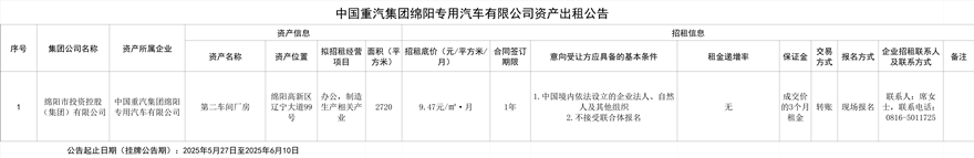 中國重汽集團(tuán)綿陽專用汽車有限公司資產(chǎn)出租公告