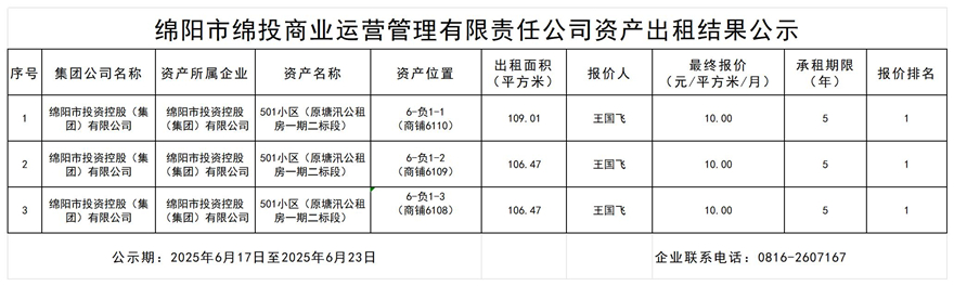 綿陽市綿投商業(yè)運(yùn)營管理有限責(zé)任公司資產(chǎn)出租結(jié)果公示