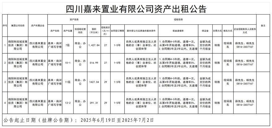 四川嘉來置業(yè)有限公司資產(chǎn)出租