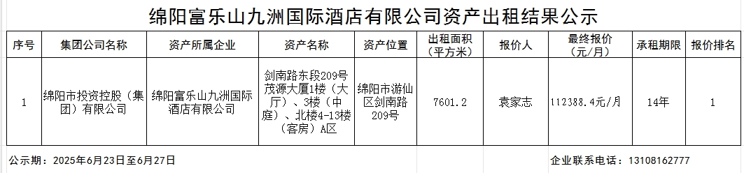 綿陽富樂山九洲國際酒店有限公司資產(chǎn)出租結(jié)果公示