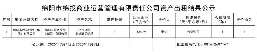 綿陽市綿投商業(yè)運營管理有限責任公司資產出租結果公示