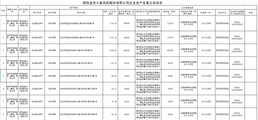 綿陽金控小額貸款股份有限公司企業(yè)資產處置公告信息
