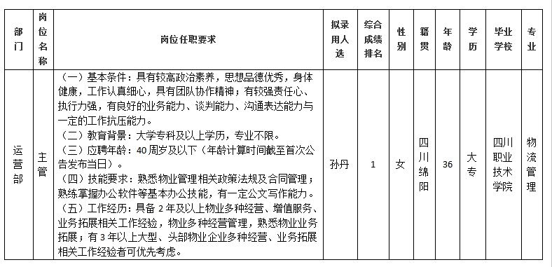 根據(jù)綿陽市康來物業(yè)服務(wù)有限公司發(fā)布的招聘公告及招聘相關(guān)規(guī)定,經(jīng)筆試、面試、背景調(diào)查等程序,擬錄用孫丹同志到綿陽市康來物業(yè)服務(wù)有限公司運(yùn)營(yíng)部工作,現(xiàn)予以公示,具體情況如下: