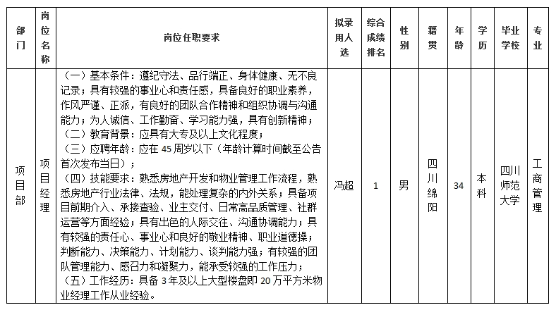 根據(jù)綿陽市康來物業(yè)服務(wù)有限公司發(fā)布的招聘公告及招聘相關(guān)規(guī)定,經(jīng)筆試、面試、背景調(diào)查等程序,擬錄用馮超同志到綿陽市康來物業(yè)服務(wù)有限公司項(xiàng)目部工作,現(xiàn)予以公示,具體情況如下: