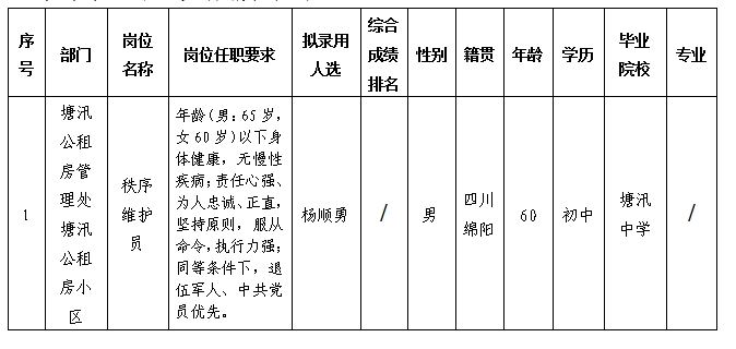 根據(jù)康居公司發(fā)布的長(zhǎng)期招聘一線勤雜人員的招聘公告相關(guān)規(guī)定,經(jīng)面試、體檢等程序,擬錄用楊順勇同志到綿陽市康居房產(chǎn)經(jīng)營(yíng)管理有限公司塘汛公租房管理處塘汛公租房小區(qū)工作,現(xiàn)予以公示,具體情況如下:
