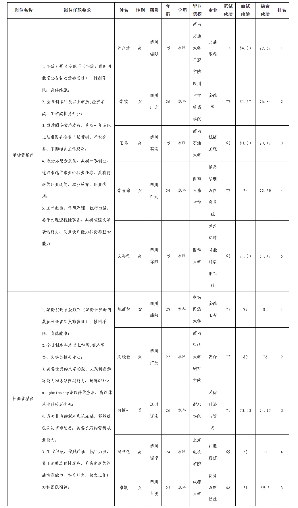 根據(jù)綿陽市綿投商業(yè)運營管理有限責(zé)任公司發(fā)布的招聘公告及招聘相關(guān)規(guī)定,經(jīng)筆試、面試等程序,現(xiàn)將筆試、面試成績予以公示。