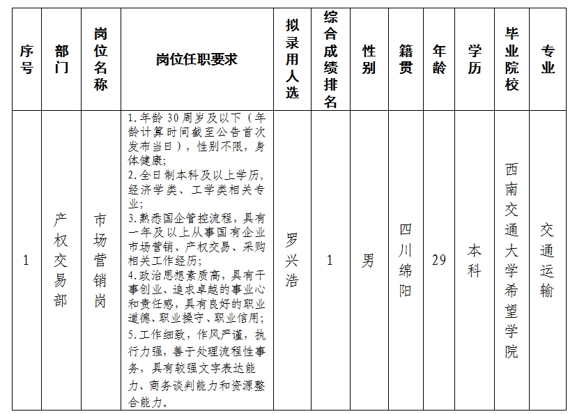 根據(jù)綿陽市綿投商業(yè)運營管理有限責(zé)任公司發(fā)布的招聘公告及招聘相關(guān)規(guī)定,經(jīng)筆試、面試、考察、體檢等程序,擬錄用羅興浩同志到產(chǎn)權(quán)交易部工作,現(xiàn)予以公示,具體情況如下: