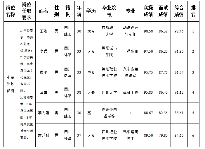 根據(jù)綿陽市汽車實驗駕駛技術(shù)學(xué)校股份有限公司發(fā)布的招聘公告及招聘相關(guān)規(guī)定,經(jīng)面試、實操等程序,現(xiàn)將面試、實操成績予以公示。