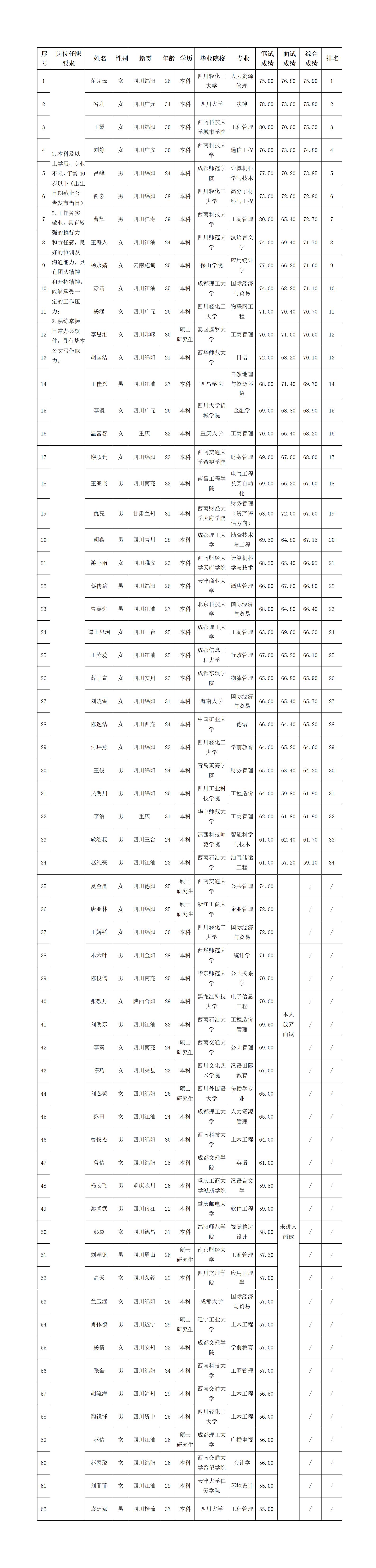 根據(jù)四川綿江能源有限公司發(fā)布的招聘公告及招聘相關規(guī)定,經筆試、面試等程序,現(xiàn)將筆試、面試成績予以公示。