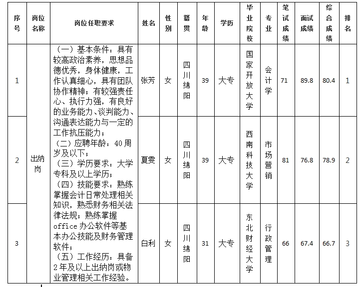 根據(jù)綿陽(yáng)市康來(lái)物業(yè)服務(wù)有限公司發(fā)布的選聘公告及選聘相關(guān)規(guī)定,經(jīng)筆試、面試等程序,現(xiàn)將筆試(面試)成績(jī)予以公示。