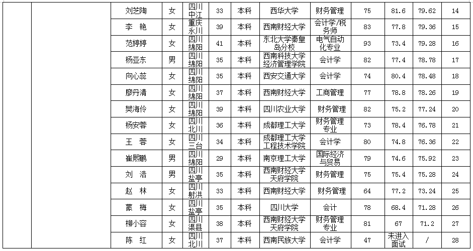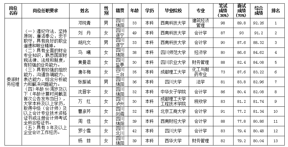 根據(jù)綿陽市投資控股(集團(tuán))有限公司發(fā)布的招聘公告及招聘相關(guān)規(guī)定,經(jīng)筆試、面試等程序,現(xiàn)將筆試(面試)成績予以公示。