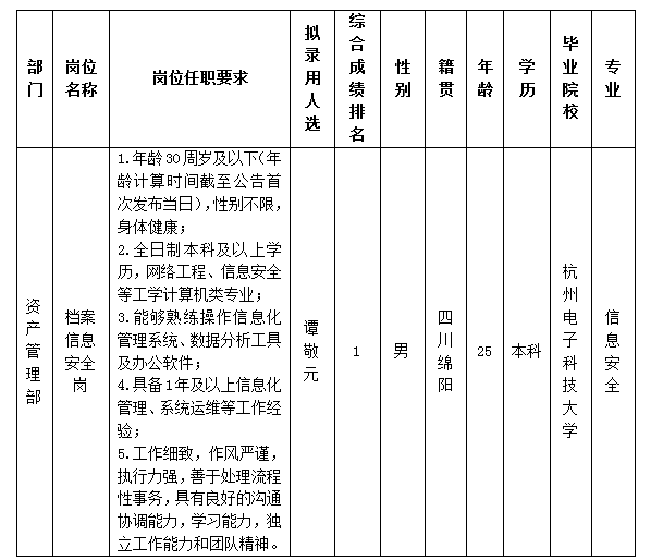 根據(jù)綿陽市綿投商業(yè)運(yùn)營管理有限責(zé)任公司發(fā)布的招聘公告及招聘相關(guān)規(guī)定,經(jīng)筆試、面試、背景調(diào)查、體檢等程序,擬錄用譚敬元同志到綿陽市綿投商業(yè)運(yùn)營管理有限責(zé)任公司工作,現(xiàn)予以公示,具體情況如下: